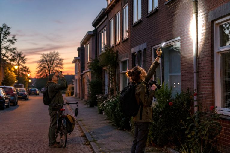Huismussen en gierzwaluwen vliegen rond zonsondergang hun nestplekken in, terwijl vleermuizen dan juist uitvliegen. Daarom vinden de onderzoeken plaats in de avond en nacht. Onderzoekers kijken of dieren bij gevels naar binnen of buiten vliegen. Soms gebruiken zij een zaklamp of camera (Foto: AI)