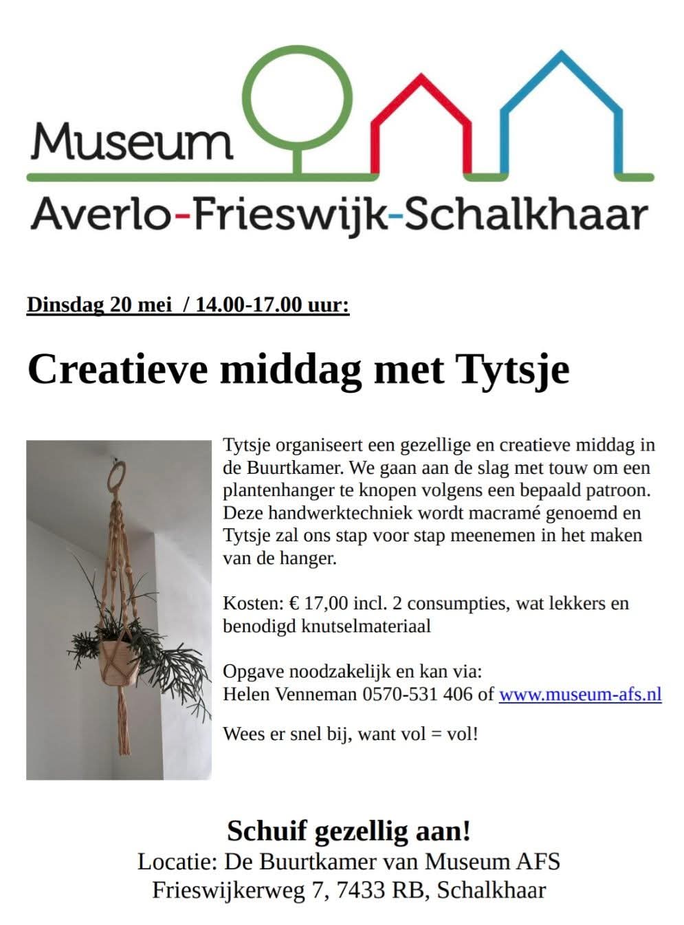 Tytsje organiseert dinsdag 20 mei a.s. een gezellige en creatieve middag (14.00 uur tot 17.00 uur) in de Buurtkamer van Museum AFS. U gaat aan de slag met touw om een plantenhanger te knopen volgens een bepaald patroon. Deze handwerktechniek wordt macrame genoemd en Tytsje zal de deelnemers stap voor stap meenemen in het maken van de hanger.