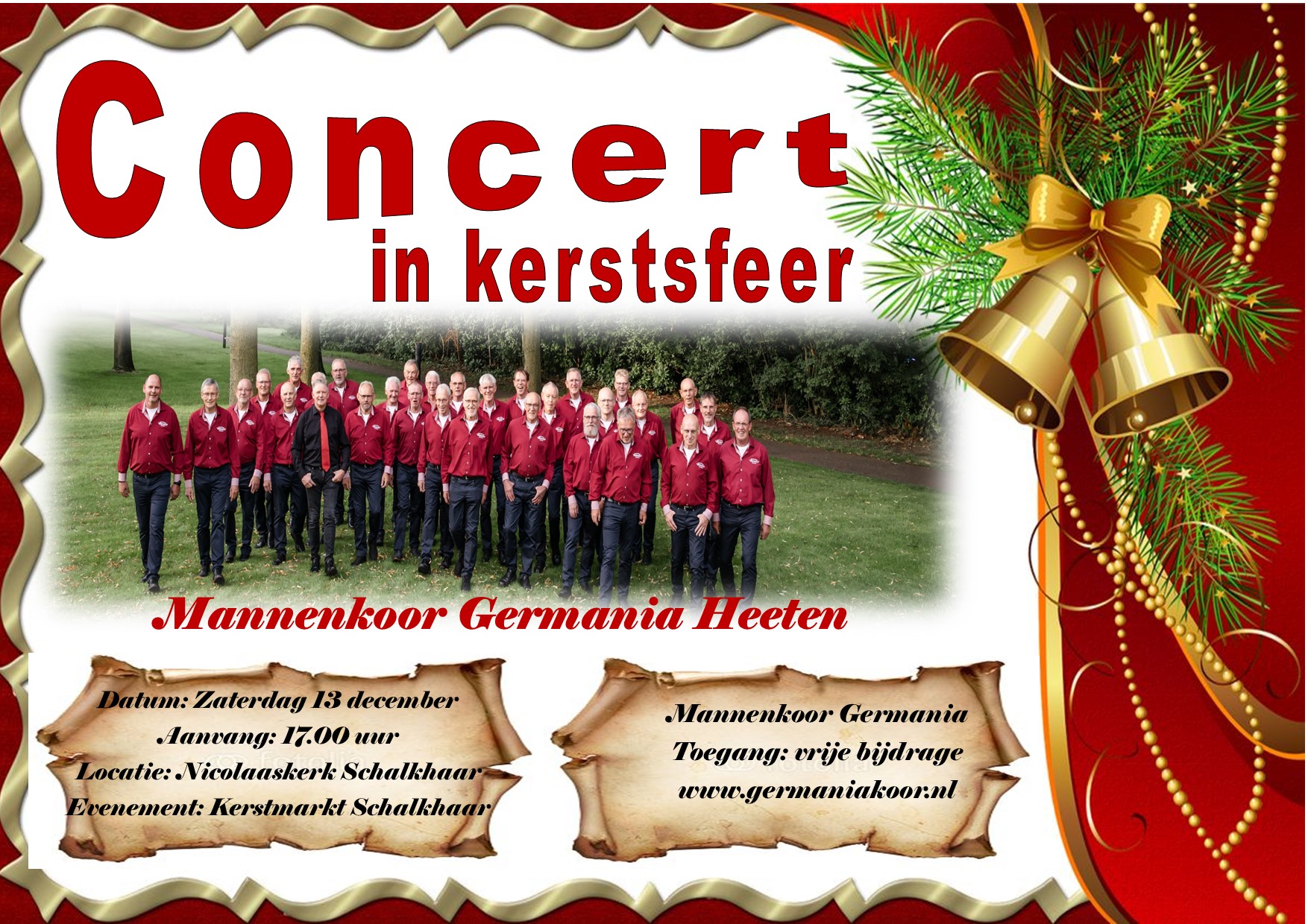 Een opvallende nieuwkomer in het repertoire is een rocknummer met een subtiele link naar het kerstgevoel. Daarmee laat Germania zien dat kerst niet één geluid kent. Het is wat ieder er zelf in hoort en voelt. Nagenoeg alle nummers worden meerstemmig gezongen. Met deze achtergrond gaat het koor met ongelofelijk veel enthousiasme optredens onder de noemer ‘Concert in Kerstsfeer’ in een brede regio verzorgen.
