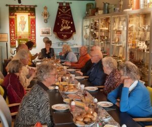 Twee lange tafels waren er nodig om alle gasten een plek te geven voor de gezellige Paaslunch van ‘Samen eten Schalkhaar’ in de Buurtkamer van Museum AFS. De ouderen waren vol lof over het initiatief van de kookvrijwilligers, die normaal gesproken een warme maaltijd bereiden.