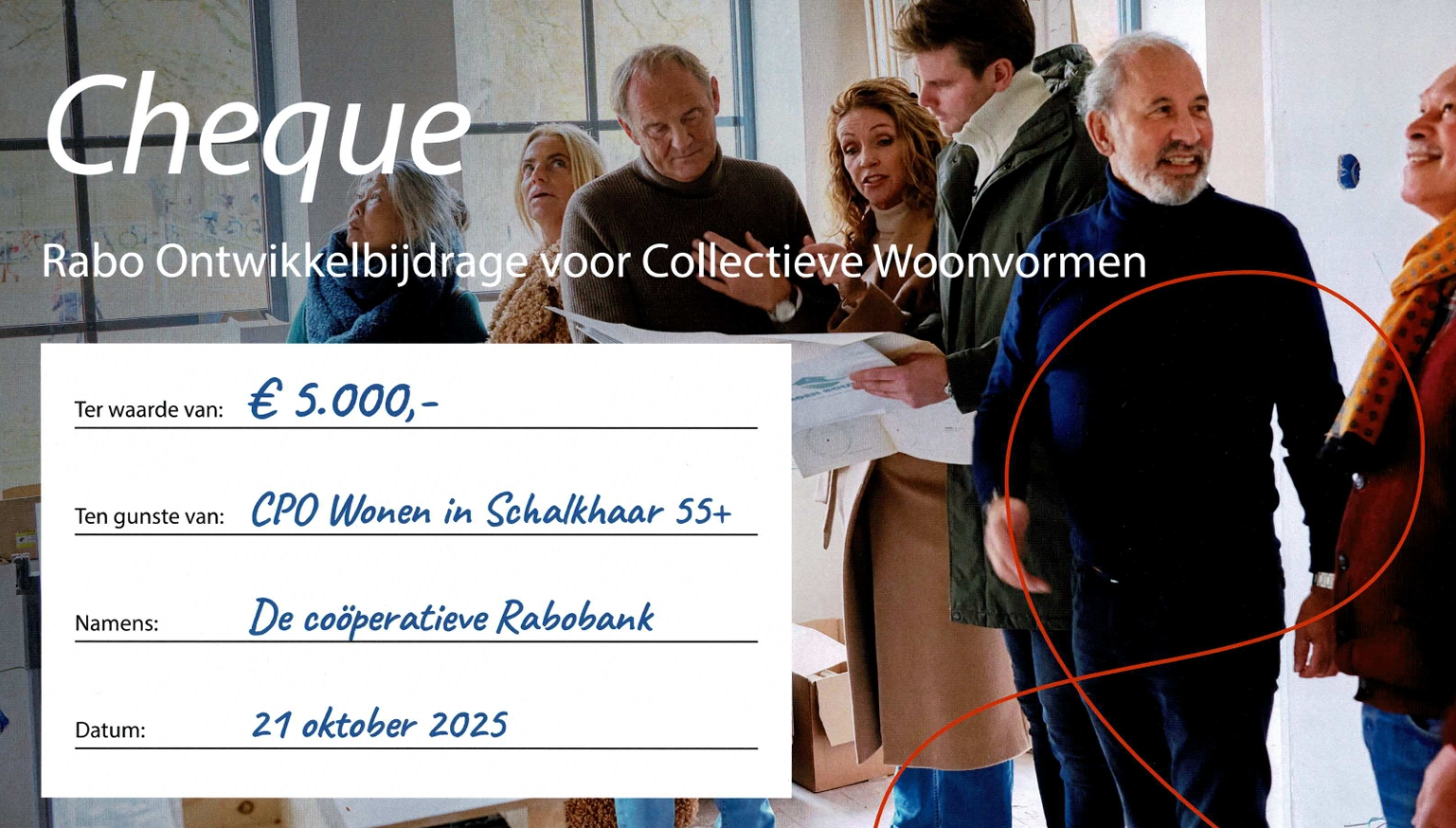 Gisteren heeft Danny Kolkman, Financieel Adviseur Wonen van de Rabobank in Deventer, een cheque ter waarde van 5000 euro overhandigd aan penningmeester Frans Haarman van de Collectief Particuliere Opdrachtgever (CPO) vereniging Wonen in Schalkhaar 55+ (WiS55+).